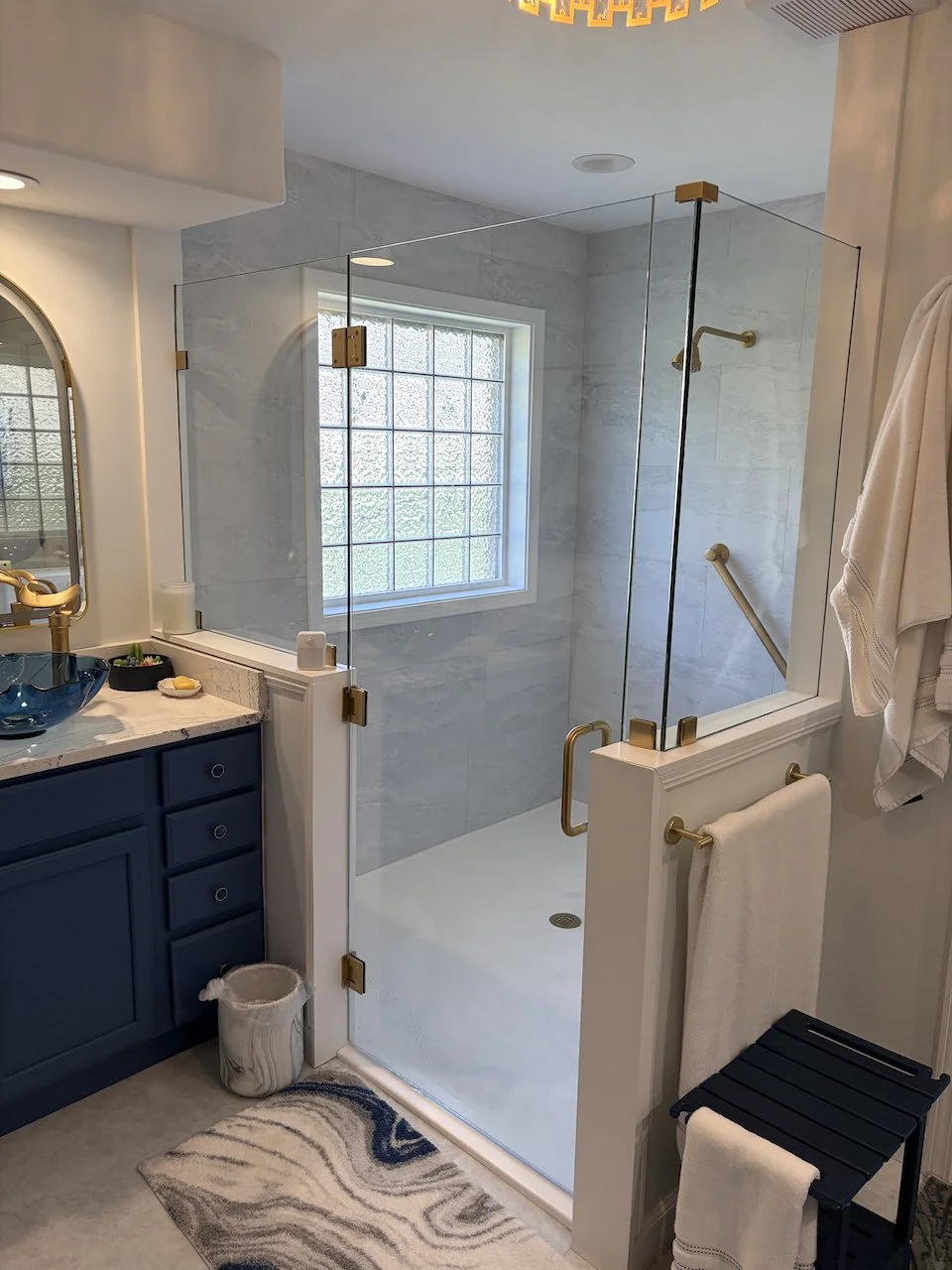 In addition to the new shower, Bill removed all of the outdated wainscoting and old cabinetry. He replaced them with a custom sink, countertop, and vanity that not only look beautiful but are also highly functional. The entire space now feels open, fresh, and perfectly tailored to my needs.